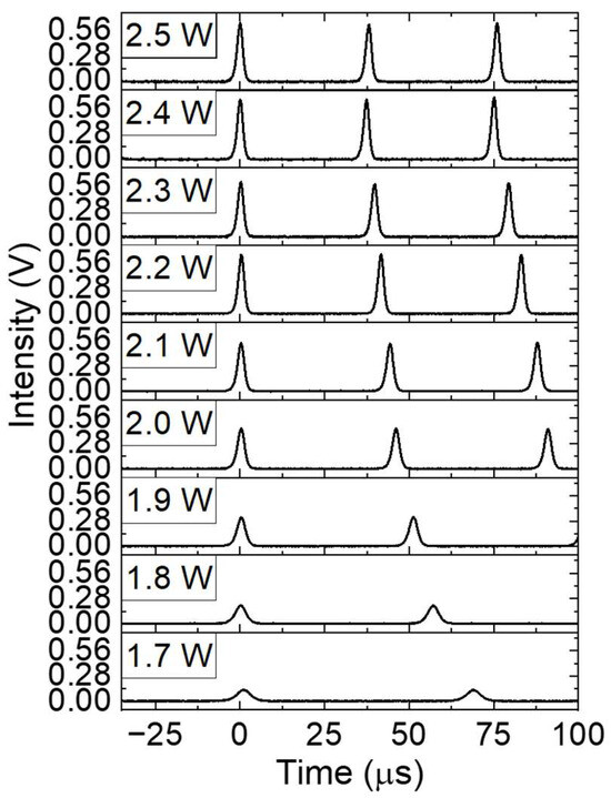A typical QS pulse train against varying pump power is shown in Figure 4. As the pump power increases, the pulse output remains stable, the pulse-to-pulse period decreases, and the pulse width narrows, typical of PQS operation. While the pulse trains are presented within the range of 1.7 to 2.5 W, stable QS pulses persist up to 2.4 W. Beyond this point, however, instead of the expected decrease in pulse spacing, the period increases very slightly, i.e., the repetition rate decreases (see Figure 5b). We attribute this behavior to the degradation of the glycerin properties by heat accumulation induced by the high power of the laser, leading to unstable Q-switched behavior.