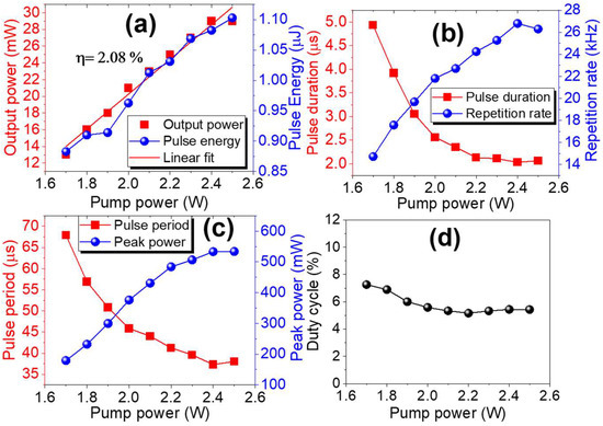 Figure 5d illustrates the duty cycle as a function of pump power for the QS pulses. From 1.7 to 2.2 W, the duty cycle decreases from 7.25% to 5.16% due to a rapid reduction in pulse period (T), from 67.90 to 41.24 µs, while the pulse width (τ) decreases even more rapidly. This results in a lower fraction of time in which the laser emits, leading to a declining duty cycle.