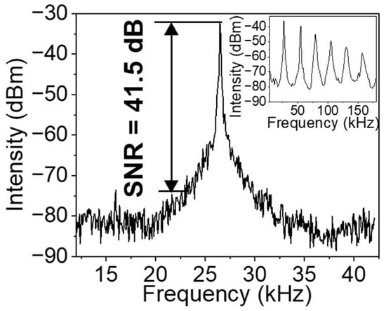 RF spectrum at the fundamental frequency of 26 kHz; inset: RF spectrum over a range of 150 kHz.