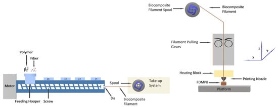 Schematic diagram of biocomposite filament-making and FDMPB printing.