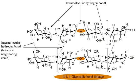 Different cellulosic allomorphic structures exhibit varying levels of crystallinity, which influences the reinforcement phase’s stiffening potential within the polymeric matrix. More amorphous celluloses have a higher affinity for water, which can potentially weaken their interactions with the non-polar PLA matrix in FDMPBs. Cellulose (structural formula: (C6H10O5)n), composed of linear polysaccharide chains made up of glucose monomers covalently linked by β(1→4) glycosidic bonds, forms two hydrogen bonds between neighboring glucose units [21], as demonstrated in Figure 2. With a non-reducing hydroxyl group at one end and a reducing hydroxyl group at the other, the latter hydroxyl group is amenable to chemical modifications for cellulose’s property adjustments [22]. Equatorial hydroxyl (-OH) groups extending radially from the glucopyranose ring are responsible for cellulose’s hydrophilic nature and intermolecular hydrogen bonding [23].
