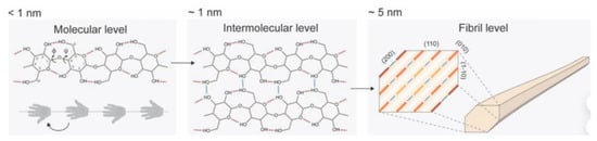 Glucan chains in cellulose self-organize into elementary fibrils, or microfibrils, through hydrogen bonding and van der Waals forces [25,26,27,28]. Due to their high surface energy, these microfibrils can aggregate into larger structures known as macrofibrils [29,30]. The structural organization of cellulose from the molecular level to elementary fibrils across different dimensional scales is illustrated in Figure 3.