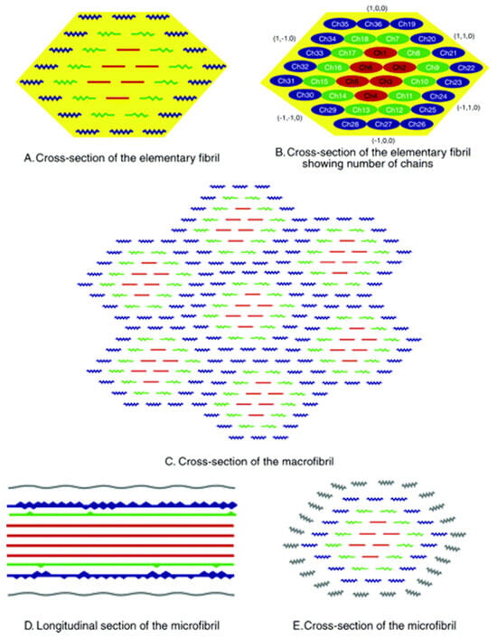 A proposed model suggests that an elementary fibril consists of a crystalline cellulose core encased in sub-crystalline and non-crystalline layers [26]. A microfibril is a cellulosic structure comprising a single elementary fibril coated with polysaccharides such as hemicelluloses and pectin. Figure 4 accurately illustrates the elementary fibril, microfibril, and macrofibril structures according to this model.