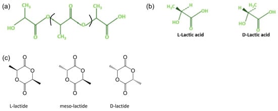 Chemical structures of (a) a PLA polymer with the structural repeat unit in parentheses, (b) lactic acid enantiomers, and (c) lactide stereoisomers. Modified and reprinted from Creative Commons Attribution License (CC BY) [69,71].