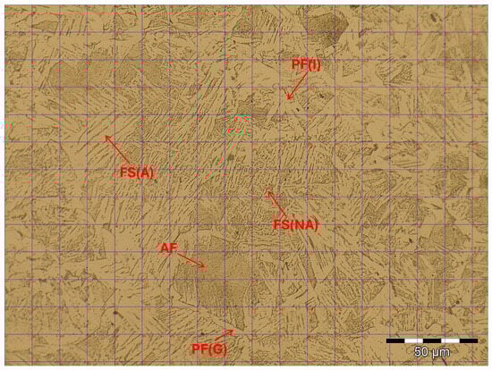 Figure 1 presents one of the micrographs analyzed in the present work, and its respective microstructural morphologies are highlighted. The micrograph also presents the grid used for the manual counting of microstructures [23], according to the [24] standard. In manual counting, the operator classifies each cell as the predominant microstructure observed in that cell, and thus performs the frequency count of the image. It can be seen that it is not simple to visually identify the different microstructural regions.