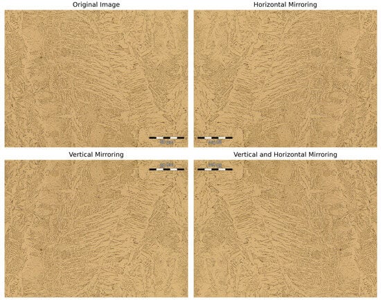 Since CNNs typically require large datasets to achieve robust performance, data augmentation was applied to artificially increase the amount of training data and reduce the risk of overfitting. The original image set was expanded fourfold by applying mirroring techniques along both the horizontal (x-axis) and vertical (y-axis) directions. This method effectively created variations of the original images while preserving key spatial features, thus enhancing the model’s generalization capabilities without introducing new content. Figure 2 illustrates an example of this quadrupling process.
