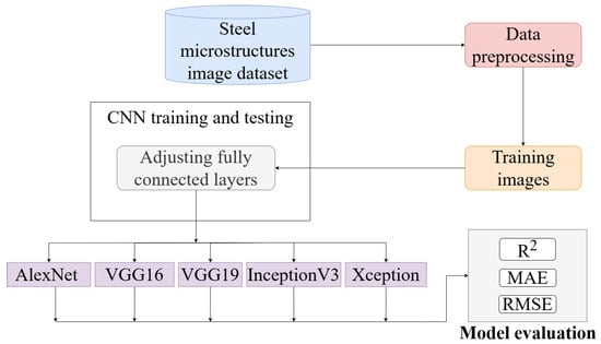 Figure 4 presents the framework that illustrates the steps taken in this work to analyze steel microstructures from a set of images. The images undergo preprocessing and are then divided into training sets. From these images, the neural network is trained, adjusting the fully connected layers in order to optimize performance. Different CNN architectures are tested: AlexNet, VGG16, VGG19, InceptionV3, and Xception. The performance of the models is measured using metrics such as R2, MAE, and RMSE, which allow for quantification of the accuracy of the predictions and the effectiveness of the models in the context of microstructure analysis.