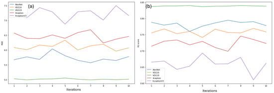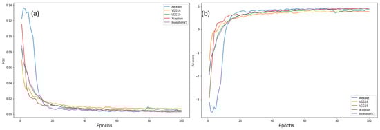Table 4 summarizes key characteristics of five widely used CNN architectures. The first column lists the model names, the second column provides reference numbers corresponding to their original publications, and the third column highlights their main architectural features. AlexNet is recognized for its pioneering use of deep architectures with ReLU activations and dropout, while VGG16 and VGG19 are known for their simplicity, utilizing small 3 × 3 filters and deep layers. InceptionV3 introduces the Inception module with multi-level convolutions and batch normalization for efficiency, and Xception uses depthwise separable convolutions to reduce the computational cost, combined with linear residual connections for enhanced feature reuse and optimization.