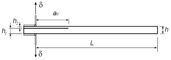 Δ takes into account that the beam is not perfectly built in. This parameter is calculated by plotting the cube-root of the compliance as a function of delamination length. The extrapolation of the linear fit through the data in the plot yields Δ as the x-intercept [1]. This was achieved by analysing various models with h1 = 4.6 mm, h2 = 1.4 mm and different initial crack lengths via FEM. Once Δ was obtained, a new model with a0 = 50 mm and an applied displacement δ = 4.5 mm was analysed. Table 3 shows the obtained results calculated following Equations (3) and (4) and, additionally, with the analytical Equation (6). These calculations were performed using linear and non-linear solutions.