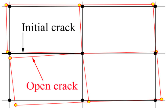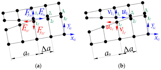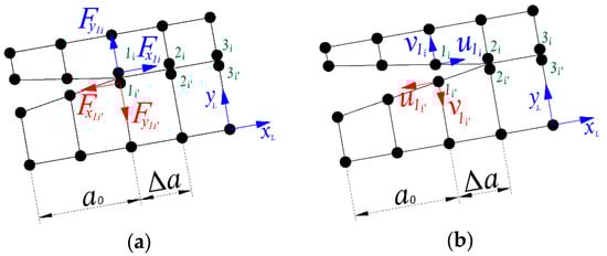 In this article, a similar method without simplification (TSEM) is also used. In this method, loads are calculated in the first step, and the corresponding displacements are calculated in a second step once the nodes have separated. Loads and displacements are, therefore, calculated in the same node pair (nodes 1i-1i’ in Figure 6 and Figure 7) [20,21].