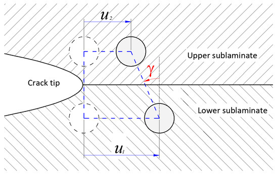 As mentioned above, the concept of modes I and II refers to the components of the energy release rate calculated in the direction perpendicular and tangential to the delamination plane, respectively. To correctly calculate GI and GII, the components of the forces and displacements involved in the energy calculation must be projected in directions perpendicular and tangential to the delamination plane (xL-yL coordinate system) (see Figure 3).