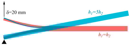 Deformed sample for different sublaminate stiffness for an applied displacement of 20 mm. Sample configuration: a0 = 50 mm. Elastic properties: Table 1.