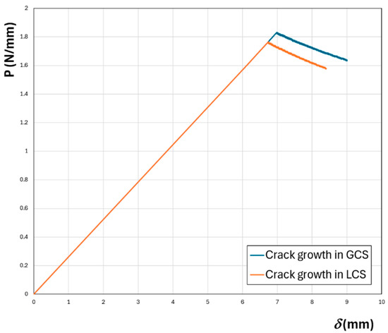 The obtained results are shown in Table 9. Figure 14 shows the corresponding load–displacement curves. As can be seen in Table 9, the difference between critical values (both load and displacement) is in the order of 4% in this case. The calculation performed in the LCS is on the safe side as it predicts the onset of crack growth at lower load and displacement.