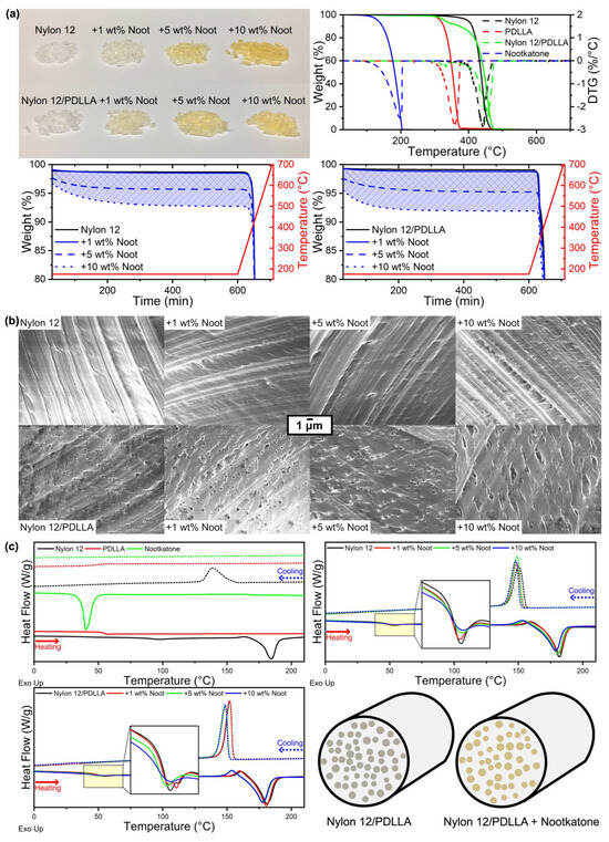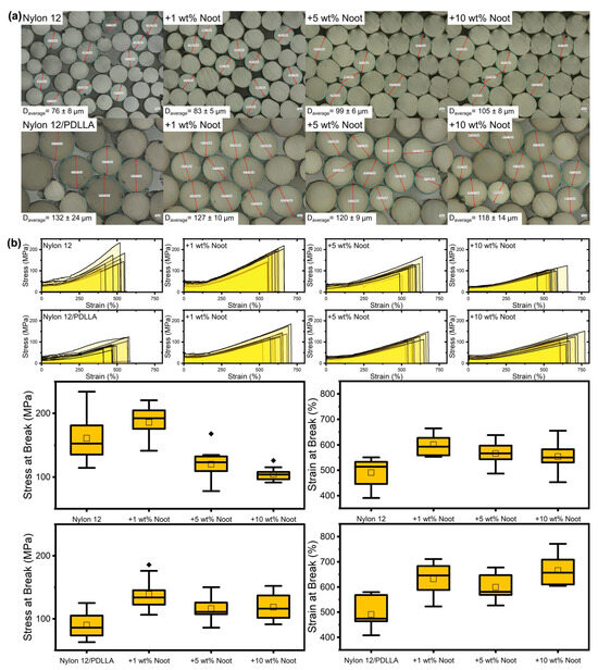 (a) Cross-sectional microscopy and (b) tensile testing of melt-spun Nylon 12 and Nylon 12/PDLLA filaments with varying nootkatone content.