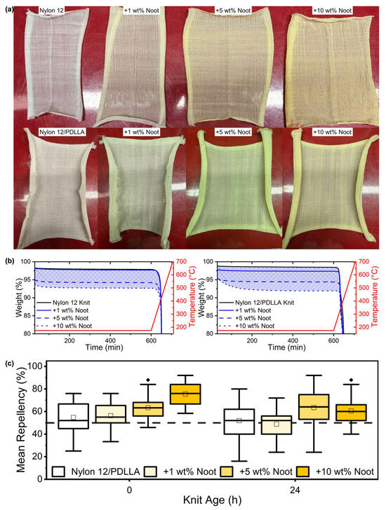 Nylon 12/PDLLA knits were more rigid and exhibited less drape than the Nylon 12 knits (Figure 3a). This increased rigidity could be due to the larger filament diameters in all Nylon 12/PDLLA samples. Post-spin thermal drawing could aid in lowering the filament diameters for better drape and overall hand feel. Additionally, the knits seemed to show increasing yellow hues with increasing nootkatone loading, as seen in the pellets. The hue also appears more vibrant in the Nylon 12/PDLLA blends than with Nylon 12. This could be due to a combination of higher nootkatone content within the Nylon/PDLLA composites and the opaqueness observed in these polymer blends.