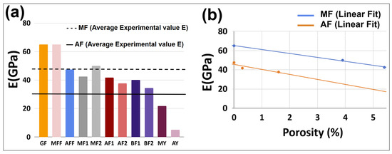 (a) Elastic modulus (E) as a function of fibers. (b) Elastic modulus (E) as a function of porosity content for modern and aged elementary fibers.