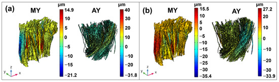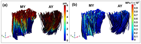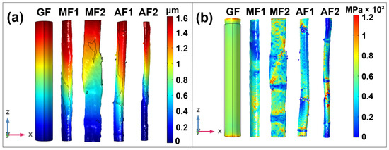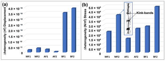 Figure 4 provides the heterogeneity in the displacement and stress distribution between aged and modern elementary fibers. The displacement distribution analysis (Figure 4a) shows that MF2 exhibits greater heterogeneity than MF1, indicating a higher presence of defects in MF2. Interestingly, aged fibers display less heterogeneity compared to modern fibers. The stress distribution analysis (Figure 4b) further demonstrates that MF2 and AF2 have higher heterogeneity than MF1 and AF1, likely due to the increased number of defects. In particular, the outline of MF2 reveals lumens, defects, and voids concentrically aligned around the lumen at defect sites [46,47], with a wider fiber profile in these regions [48].