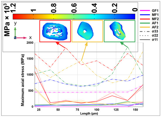 To better understand the variability in stress, the maximum axial stress was calculated for both modern and aged fibers along their transverse cross-sections every 20 µm along the fiber length, as shown in Figure 6. The results indicate that the tensile direction (σ33) shows higher stress compared to other axial components (σ22 and σ11), with stress values reaching approximately 1700 MPa for modern fibers and aged fibers at specific locations, which matches with the experimental tensile strength [43]. These values highlight the critical role of stress concentration induced by defects, pores, and lumens [42,49]. This is further illustrated in the transverse cross-sections of fibers at higher-stress locations (Figure 6), where MF2 shows stress concentration around pores in kink-band areas, and similar behavior is observed in aged fibers, with higher stress around pores and lumens. These findings suggest that defects and lumens can act as initiation points for failure, with pores in defect areas potentially triggering fiber rupture. This type of behavior was observed for flax bundles and hemp fibers in the literature [42,45,49].