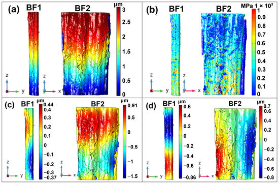 Figure 3 shows the displacement plot in the z-direction and the axial stress distribution (σ33) for elementary fibers in the XZ plane. The z-direction displacement plot confirms the boundary conditions for tensile testing, where the bottom surface is fixed, and a maximum displacement of 1.6 µm for elementary fibers. The mean axial stress calculated for fiber models were in the range of 350 MPa to 500 MPa, which matches the average tensile strength of the experimental values [45]. The axial stress component shows homogenous stress distribution for geometrical fibers, and the stress heterogeneity in the surface of the fiber models can be observed; notably, higher stress concentration is observed in the surface, which may be due to surface roughness. Also, the higher stress can be observed in defective regions, which may be due to pores present at this region and also due to the deviations in the microfibril angle in this region. The homogenous distribution in the displacement plot can be observed in GF compared to the fiber models. In order to better understand the heterogeneity in the displacement and stress distribution on the surface of fiber models compared to the geometrical model, it is further quantified using Equations (5) and (6).
