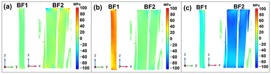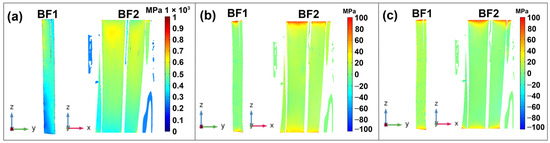 Stress (σ33) and strain distribution along the tensile direction further highlight the heterogeneity in the surface of the fiber bundles. To quantify this heterogeneity, an analysis was performed. Figure 4 shows that larger bundles containing more elementary fibers (BF2) exhibit higher heterogeneity compared to the smaller bundles with three fibers (BF1) due to themore complex internal structure in larger bundles. The fact that BF1 and BF2 are presented in the YZ and XZ planes, respectively, enhances the visual understanding of this heterogeneity. The mean axial stress values in the simulation range from 300 to 400 MPa, which is close to the experimental tensile strengths of flax fiber bundles reported in the literature. To better understand the stress distribution, an examination of the longitudinal cross-sections (Figure 8 and Figure 9) was conducted, revealing higher stress concentrations at areas of porosity and near the fiber surface. These high-stress regions are particularly prominent in BF2, and the porosity between fibers is more significant in BF2, likely due to the removal of the middle lamella during the extraction process [54]. The lumen in the elementary fibers in bundles and the surface roughness weakens the mechanical integrity of the bundle by acting as stress concentrators, contributing to localized failure [42,49,55]. Higher stress was observed in the axial components (σ33, σ22, σ11) than in the shear components (σ12, σ13, σ23). However, both exhibited heterogeneity in stress distribution along the longitudinal cross-section of the fiber, which can be seen in Figure 8 and Figure 9.