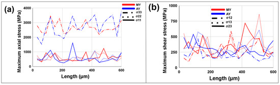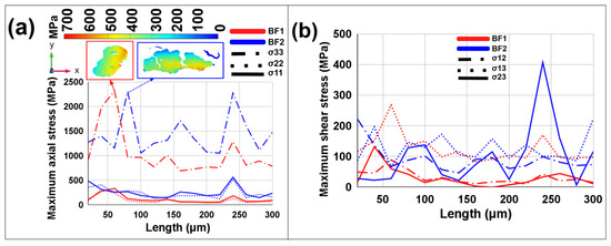 To gain further insight into stress variability, the maximum axial and shear stress for fiber bundles was measured along their transverse cross-sections at 20 µm intervals along the fiber length, as shown in Figure 10. The maximum axial stress values in the tensile direction reach around 2200 MPa at specific points, which is approximately three times higher than the average tensile strength of flax fiber bundles reported in the literature. This sharp increase in stress is likely due to the influence of surface defects and lumen in elementary fiber, which are shown in the transverse cross-sections of both BF1 and BF2. Although the simulation model does not yet account for damage criteria or fiber–fiber bonding, such as the characteristics of the middle lamella, which will be incorporated in future studies to better align with experimental results, it emphasizes the significant influence of surface imperfections and porosity on stress concentration. The maximum stress points were observed on the surfaces of the bundles, suggesting a potential initiation of rupture due to surface irregularities and roughness. The stress distribution also shows that the axial stress components (σ33, σ22, σ11) are significantly higher than the shear components (σ12, σ13, σ23). This suggests that the primary mode of stress within the fiber bundles is tensile rather than shear, as expected in a tensile test scenario. However, within the shear stress components, σ13 and σ23 (related to shear along the fiber’s length in tensile direction) exhibit higher values compared to σ12, indicating that shear stresses along certain planes are more pronounced.