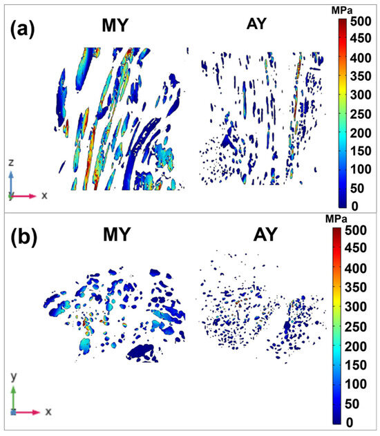 The mean axial strengths obtained are 140 MPa for modern yarns and 53 MPa for aged yarns, which are lower than the experimental values in the literature [57,58]. This discrepancy can be attributed to the assumptions of linear elasticity and the exclusion of frictional properties in the model, which will be addressed in future studies. Despite these limitations, the current model provides valuable insights into the stress distribution in both modern and aged yarns. Notably, aged yarns exhibit the structure of ply yarns, while modern yarns appear to be single yarns. In addition, a higher degree of fiber individualization is observed in aged yarns, likely due to long-term evolution and degradation over time [31,34]. The axial stress distribution (σ33) in the longitudinal cross-section of the yarns, presented in Figure 13, reaches up to 500 MPa, showing heterogeneous stress distribution within both the fibers and bundles. In Figure 13a, the stress in modern yarn appears to be concentrated near the surface, while in aged yarn, it is more fragmented and lower in intensity, likely due to increased defects and material degradation. In Figure 13b, modern yarn exhibits localized high-stress regions, particularly around fiber–fiber interfaces and voids, whereas aged yarn shows a more dispersed and lower-intensity stress distribution, indicating a weakened load-bearing capacity. There is also clear evidence of higher discontinuities in aged yarns compared to modern yarns, further indicating the degradation of fibers within the internal structure of aged yarns. The degradation patterns observed in ancient fibers (e.g., porosity increase, interfacial debonding) align qualitatively with those reported for modern flax fibers aged for short-term (1–10 years) under environmental stress. For example, flax/bio-epoxy composites exposed to 75% relative humidity for 24 months exhibited a 30% reduction in tensile strength, attributed to microfibril disorientation and middle lamella hydrolysis [37], mirroring the mechanisms observed here in ancient fibers but at an accelerated scale. Similarly, UV-exposed sisal fibers [29] showed lumen collapse and surface cracking within 5 years, paralleling our findings in archaeological flax. These comparisons suggest that the key aging mechanisms (e.g., polysaccharide depolymerization, defect propagation) are consistent across timescales, though their kinetics depend on environmental conditions. This underscores the importance of defect mitigation (e.g., coatings, hybridization) in extending the service life of modern flax composites.