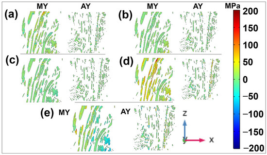 (a,b) Distribution of axial stress on longitudinal cross-section of yarns in the XZ plane: σ22 and σ11. (c–e) Distribution of shear stress on longitudinal cross-section of yarns in the XZ plane: σ12, σ13, and σ23.