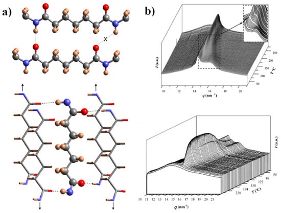 (a) Scheme of the unfavorable hydrogen-bonding geometry between pimelamide units having an all-trans conformation (up) and scheme showing the 2H-bonding structure based on the rotation of the two amide planes of the pimelamide unit in opposite directions from the plane defined by its methylene carbons (down). The monoclinic unit cell is generated when the external chains (stick representation) are shifted along the chain axis direction (see arrows) with respect to the central chain (ball and stick representation). Color code: nitrogen, blue; oxygen, red; carbon, grey; hydrogen, brown. (b) Three-dimensional representation of WAXD profiles of nylon 47 during heating (3 °C/min) (up) and cooling (3 °C/min) (down). The inset shows the transformation of the initial structure to an intermediate one (up). Reproduced with permission from Elsevier [27].