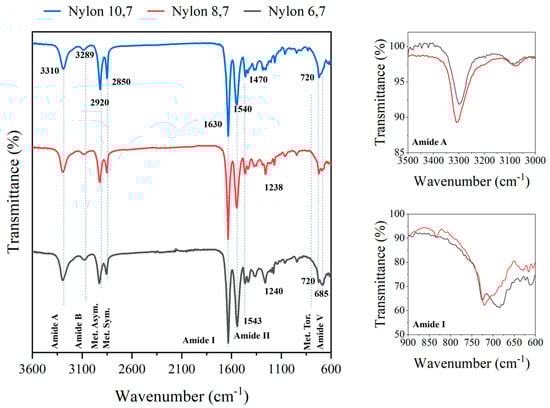 In all cases, FTIR spectra (Figure 2) showed the typical bands associated with the amide and methylene groups of nylons, with small shift differences, and logically, there was an increase in the relative intensity of methylene bands as the diamine changed, in the sequence of DAH, DAO and DAD. Figure 2 shows the FTIR spectra of the synthesized nylons. Differences concern small shifts of the characteristic amide and methylene groups, and logically, the increase in the relative intensity of methylene bands, as the diamine changed in the sequence of DAH, DAO and DAD. Specifically, amide A, amide B, amide I, amide II and amide III bands were observed at 3310, 3289, 1630, 1543–1540 and 1240–1238 cm−1, respectively. Asymmetric and symmetric CH2 stretching vibrations were observed at 2920 and 2850 cm−1, respectively, while the twisting of the CH2-NH bond of CH2 groups was detected at 720 cm−1. An amide V band was also observed at 685 cm−1, logically increasing its relative intensity with respect to the 720 cm−1 band when the length of the diamine unit decreased (i.e., amide V appeared as a shoulder or a well-differentiated peak in nylon, 10,7 and 6,7, respectively). The specific value of the amide V band is interesting since for even and even–even nylons, it is associated with the α/β structures (i.e., those characterized by X-ray diffraction patterns with two intense reflections at 4.40 and 3.85 nm). The inset of Figure 2 shows that the clear amide V band of nylon 10,7 decreased in intensity and shifted to around 690 cm−1 when the sample was crystallized from the melt, which is evidence of a structural transition towards a pseudohexagonal arrangement. It should be pointed out that the amide VI band (640 cm−1), which is proof of a typical γ form was not detected. In addition, the amide A band shifted after crystallization towards a lower wavenumber (i.e., 3295 cm−1) suggesting a worse formation of hydrogen bonds (inset).
