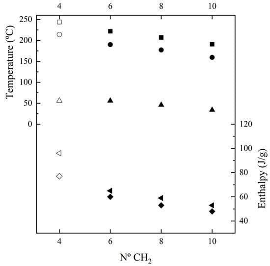 Plot of the variation in Tf (▪), ΔHf (first heating, ◄), Tc (●), ΔHc (♦) and Tg (▲) with the number of methylene groups in the diamine moiety. Empty symbols correspond to those previously reported for nylon 4,7 [27].
