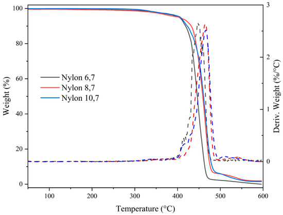 All studied nylons showed a relatively high thermal stability that allows their processing in the melt state. Figure 6 shows the corresponding TGA and DTGA curves while the main degradation data are summarized in Table 4. Note that in the worst case, the temperature associated with the beginning of degradation is more than 180 °C higher than the melting temperature (e.g., temperatures of 222 °C and 410 °C are characteristic of nylon 6,7). Degradation basically occurs according to a major step that at least corresponds to a decomposition higher than 86%. Decomposition started with a minority process, which cannot be correlated with the number of methylene groups in the repeat unit or with differences in molecular weight (i.e., an influence of terminal groups). In any case, this decomposition represents, at maximum, a 5% weight loss (nylons 6,7 and 10,7). Differences can also be observed at the end of degradation, where a third minority step can be observed for nylons with a higher number of methylene groups (i.e., 4,7% and 6,6% for nylons 8,7 and 10,7, respectively). At 600 °C, no char yield was detected for the three studied polyamides. Weight losses associated with water uptake were not detected as a consequence of the effective drying of the sample before performing analyses.