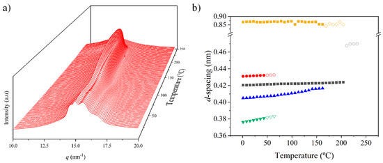- The two reflections at 0.421 nm and 0.404 nm progressively approach each other (Figure 7c) and join in a single spacing at 0.420 nm at a temperature of 231 °C (Figure 7b,c). Basically, the less intense reflection at the spacing of 0.404 nm has the higher shift and appears as the shoulder of the main reflection at temperatures close to 130 °C (Figure 7b). Note that the intensity of the main reflection clearly increases as a consequence of the indicated overlapping (Figure 7d).
