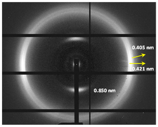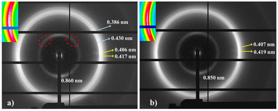 The specific plot of the cooling process indicated that the sample crystallized from the melt according to the Brill structure, which subsequently transformed into the distorted pseudohexagonal form. The dashed white circle (Figure 13a) highlights the appearance of the 0.414 nm reflection as a peak shoulder at a temperature close to 140 °C. Note that the Brill structure remains in a wider temperature interval (i.e., from 195 °C to 140 °C) than observed in the heating scans. The intensity of the main 0.427 nm reflection clearly decreased and reached a practically constant intensity when the two peaks of the distorted form were clearly distinguished (i.e., 120 °C). Note that only the shoulder/peak at 0.417–0.402 nm had a significant spacing decrease. The amorphous halo at 0.465 nm progressively decreased in intensity and became overlapped at low temperature with the 0.423 nm peak of the modified α-form that appeared around 100 °C. The two peaks of these forms developed with a very low intensity (i.e., the ratio was clearly lower than observed for the solution-crystallized sample).