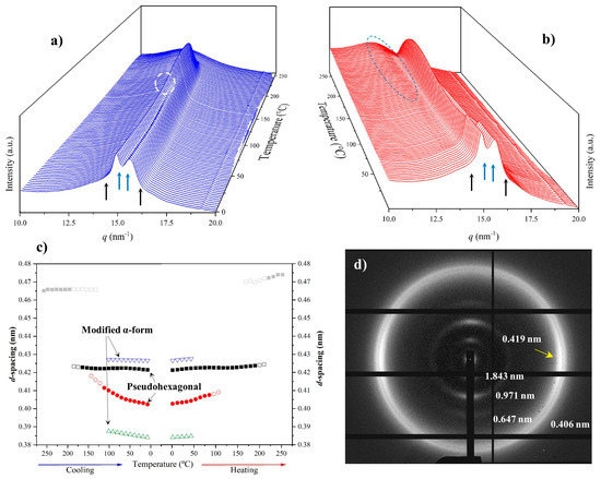 A practically reversible behavior was observed in the subsequent heating process. Specifically, this included the disappearance of the modified α-form around 70 °C, the definition of a clear amorphous halo at temperatures close to 150 °C (blue ellipsoid) and the development of the Brill structure around 140 °C, and the melting process that was initiated around 200 °C. This reversibility is more evident in Figure 13c, where a shift of the main transitions to lower temperatures is also detected in the cooling process (obviously crystallization took place at a lower temperature than fusion). In this sense, note the different temperature intervals where the Brill structure can be observed (10 °C and 30 °C for cooling and reheating processes, respectively).