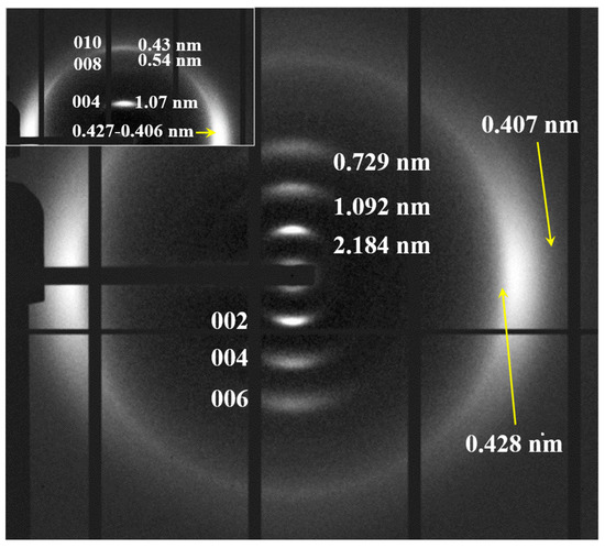 It was possible to obtain oriented fiber patterns of nylon 10,7 by stretching from the melt (Figure 15). Logically, in this case, only the pattern of the distorted pseudohexagonal arrangement was obtained. Note the high intensity of the 00l reflections (l = even), which points to a chain repeat of 4.36 nm and a shortening close to 0.05 nm/amide group with respect to the fully extended conformation (4.75–4.56 nm). As indicated for previous nylons, the fiber patterns obey a distortion of the ideal pseudohexagonal unit cell defined by the following parameters: a = b = 0.479 nm, c (chain axis) = 4.36 nm and γ = 60°. Fiber patterns of the isomeric nylon 7,10 have been previously reported (see the inset of Figure 15) and corresponded to a similar distorted pseudohexagonal cell with a similar but slightly higher chain shortening (i.e., 0.07 nm/amide group). Remarkable differences are also observed in the intensity of the 00l reflections, which, in a simple way, can be justified by taking into account the different distribution of the CO groups. These have a higher electronic density, and consequently, have a higher contribution to the diffraction pattern. Specifically, these groups are separated by 12- and 5-chain atoms in nylon 10,7, whereas 9- and 8-chain atoms correspond to nylon 7,10 (i.e., a more regular distribution along the chain axis).