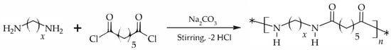 The selected nylons were obtained via interfacial polymerization (Scheme 1) using previously optimized conditions. In a typical procedure, 10 mmol of diamine and 2 eq of proton acceptor (sodium carbonate) were dissolved in 40 mL of water, in the case of DAH and DAO, or in a 40 mL solution of 3:1 water–acetone in the case of DAD. The solution was then stirred at room temperature using an Ultraturrax® homogenizer (IKA, Staufen im Breisgau, Germany). A total of 10 mmol of PDC was separately dissolved in 40 mL of dichloromethane. This second solution was added dropwise over a period of 60 min to the stirred aqueous phase. After an additional period of 30 min, the reaction was stopped by precipitation with water. The solid was subsequently washed with water, ethanol and diethyl ether. The obtained white polymer was then dried overnight at room temperature under reduced pressure.