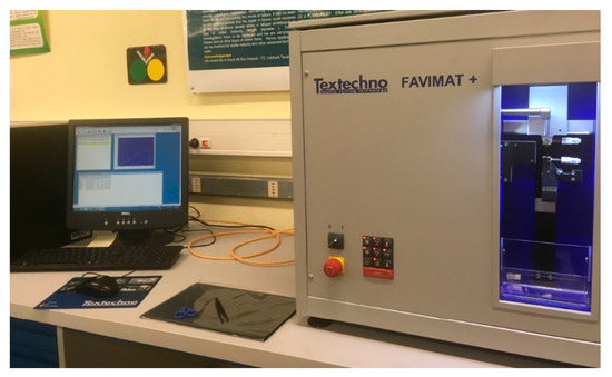 The tensile properties of elementary fibers were measured using the Textechno Favimat device (Figure 5) equipped with a 2 N load cell. Elementary fibers were extracted and mounted on 3 mg adhesive tabs, to avoid slippage between the jaws. The Favimat system features an integrated unit for the simultaneous measurement of fineness and tensile properties.