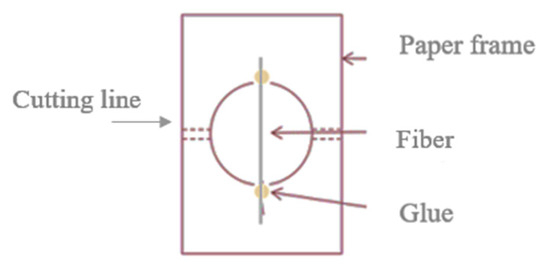 The mechanical properties of flax technical fiber bundles were evaluated using the MTS testing device (MTS Systems Corporation, Eden Prairie, MN, USA; Model 20/M) with a 100 N load cell. This apparatus applies controlled tensile forces to the fiber until rupture, allowing measurements of stress and strain. The samples were positioned on perforated paper frames (15 mm distance) in which they were glued using a cyanoacrylate adhesive to prevent slippage (Figure 6).
