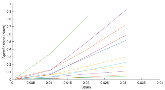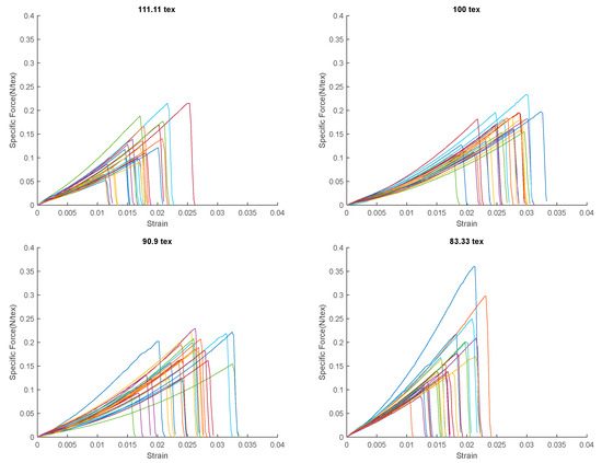 The tensile behavior of the four flax yarns (111.11 tex, 100 tex, 90.9 tex, and 83.33 tex) is presented in Figure 11, which displays the specific force (N/tex) as a function of strain.