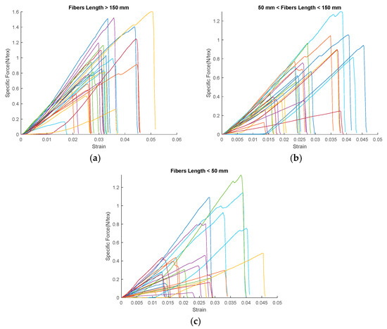 Specific force–strain behavior of technical flax fiber bundles: (a) for fiber length more than 150 mm; (b) for fiber length between 50 and 150 mm; (c) for fiber length less than 50 mm.