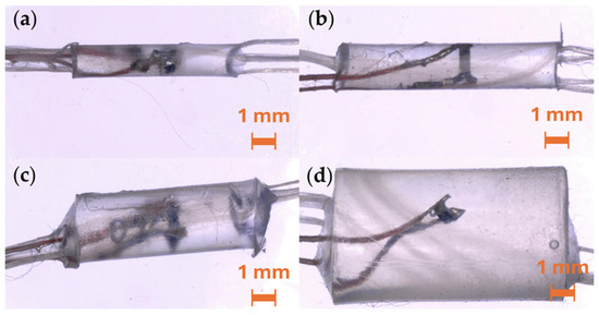 Microscope images of a selection of encapsulated resistors that have been soldered onto litz wire. The encapsulation contains four supporting polyester yarns; 20× magnification. (a) 1.5 mm diameter micro-pod (E1.5); (b) 2.0 mm diameter micro-pod (E2); (c) 3.0 mm diameter micro-pod (E3); (d) 6.0 mm diameter micro-pod (E6).