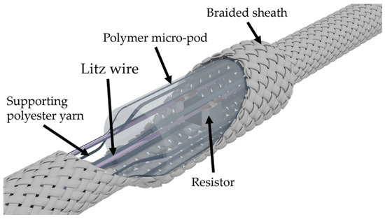 The wetting, flexing, chemical exposure (detergent) and abrasion experienced by textiles during a machine-washing cycle introduce durability challenges for the embedded electronics [9,10]. To mitigate these issues, recent research has focused on developing protective coatings, robust encapsulation methods, and novel material designs with some success. For example, studies by Ojstršek et al. (2022) [11] have reviewed the use of the dip-coating technique, highlighting its impacts on functionality, durability, and sustainability. Also, Liman et al. (2022) [12] presented a comprehensive review on the current state of the art in washable e-textile designs, focusing on innovative strategies such as unique textile geometries, encapsulation, adhesion behavior, self-repairability, and standardized washing protocols to address common washing stresses. These approaches have shown promising results in extending the lifespan and functionality of e-textiles [11,13,14,15]. Given the diversity of methods used to incorporate electronics within textiles, wash durability remains an ongoing area of investigation for many researchers [3,8,16,17]. This work focuses on the wash durability of e-yarns, where electronics are embedded within the core of textile yarns, which are then incorporated into textiles. The technology has been applied to a disparate range of applications, including fall and near-fall detection [18,19] and solar energy harvesting [20,21]. The production process begins with soldering a small-scale commercial component (in this study, a 10 kΩ resistor) onto fine, flexible, multistrand litz wires with an overall diameter of approximately 250 μm. This step ensures a robust electrical and mechanical connection between the wire and the component. To enhance the durability of the ensemble, the solder joints and component(s) are encapsulated within a rigid resin micro-pod, which is slightly larger than the component itself. Encapsulation is crucial for safeguarding electronic components within e-yarns, preserving their durability, performance, and resistance to mechanical stress and moisture exposure during washing [22,23,24]. Supporting yarns running parallel to the litz wires are added at this stage to create a uniform cross-section and improve the mechanical strength. Finally, the wires and encapsulated device are embedded within a cylindrical textile structure, typically a braid, which provides additional stability and protection, and aids in the processability of the final device [25].