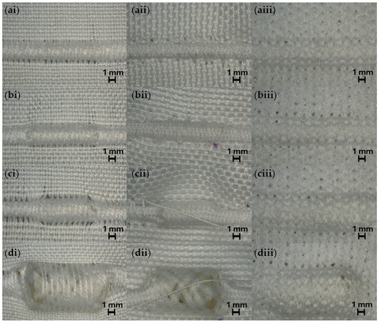 Microscope images of electronic yarns embedded within textile structures. Images focus on the location of the electronic component; 20× magnification. (a) 1.5 mm diameter micro-pod (E1.5); (b) 2.0 mm diameter micro-pod (E2); (c) 3.0 mm diameter micro-pod (E3); (d) 6.0 mm diameter micro-pod (E6). (i) woven structure; (ii) embroidered; (iii) integrated-knit.
