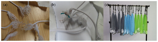 Visual representation of the e-yarn preliminary trials and drying strategy: (a) samples before the preliminary wash trial; (b) samples after the preliminary wash trial, showing entanglement; and (c) the drying process using the wash bag.