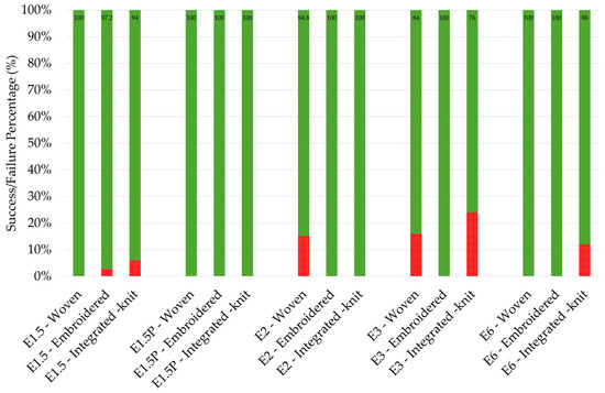 In contrast to the woven and embroidered fabrics, integrated-knit fabrics exhibited more variability in their durability, depending on the encapsulation size. Samples with encapsulation sizes E2 and E1.5P performed exceptionally well, with both achieving a 100% success rate and no recorded failures. Knitted samples with encapsulation sizes E1.5 and E6 displayed slightly lower durability, with 94% and 88% success rates, respectively. While these results still indicate relatively strong performance, the presence of some failures highlights potential challenges in maintaining durability for these configurations. The knitted sample with encapsulation size E3 showed the poorest performance of all, achieving only a 76% success rate, with a 24% failure rate. This significant reduction in durability suggested that the combination of a knitted fabric structure and E3 encapsulation may not provide sufficient protection for e-yarns under the strain of repeated washing.