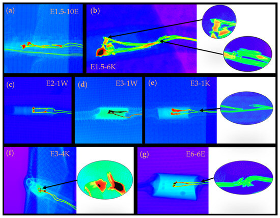 Radiographs of samples where breakages occurred; for contrast, the greyscale has been converted to a spectrum scale in which white/purple represents low absorption and red/black represents high X-ray absorption. Insert images have been used to magnify areas where breakages have occurred. (a) Sample E1.5-10E; (b) Sample E1.5-6K; (c) Sample E2-1W; (d) Sample E3-1W; (e) Sample E3-1K; (f) Sample E3-4K; (g) Sample E6-6E.