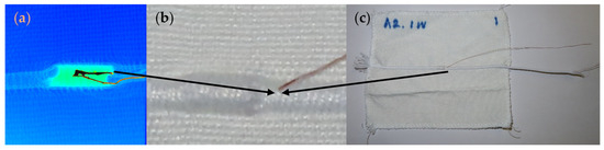 Faulty samples were thoroughly examined via X-ray radiography utilizing a Nikon XT H 225 (XT H Series–Nikon Metrology, Belgium), run at a kV peak of 70 kV with a power of 6 W, to identify the underlying causes of failure. This investigation sought to determine whether the failures originated from manufacturing defects, such as poor soldering quality and air bubbles in the encapsulation, or if they were the result of external factors, such as the mechanical stress, flexing, or strain experienced during the wash cycles. By analyzing the internal structure of the samples, weak points and structural vulnerabilities were identified, providing crucial insights into potential areas for improvement. Importantly, the non-destructive nature of this method ensured that the samples did not experience additional damage in the disassembly of the sample (to identify the fault). Non-destructive X-ray radiography enables detailed imaging of internal structures without damage to the samples and allows exhaustive evaluations of the integrity of the material [34,35]. Previous studies have successfully used this method to elucidate the performance of conductive materials in textiles, which demonstrates its reliability and effectiveness in the identification of potential failure points, improving the development of textiles and durable textiles [36,37,38,39].