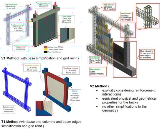 TRM is an advanced method for strengthening masonry and concrete. Several studies [26,27] have shown evidence of the effectiveness of TRM in enhancing flexural capacity and ductility. Accurate finite element models, specifically those with a focus on concrete damaged plasticity, may enable better predictions of improved structural performance using TRM for different load conditions. Flexible PU seismic joints and flexible PU infill strengthening are two innovative techniques to enhance the performance of reinforced concrete frames against earthquakes. The research work done by Vanian et al., 2024, Rousakis et al., 2021, and Akyildiz et al., 2021 [32,33,34], on polyurethane flexible joints (PUFJ) and fiber-reinforced polyurethane (FRPU) jacketing, respectively, points out a significant ductility gain and energy dissipation enhancement. These studies underline the need for developing new advanced 3D finite element modeling capable of capturing complex structural interactions. Information about the models is provided in Figure 1.