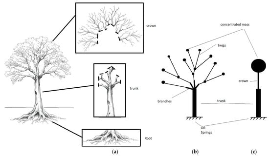 Figure 2. Finite element method (FEM) modeling approaches for tree structures, showing increasing levels of abstraction from left to right. (a) High-fidelity 3D model. (b) Simplified branch-mass model. (c) Equivalent two-element model.