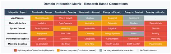 • This comprehensive review identifies 36 specific interaction points between structural, energy, forestry, and occupant comfort modeling approaches for vertical forest buildings, revealing that 58% require high integration (direct coupling) and 28% require medium integration (coordination).